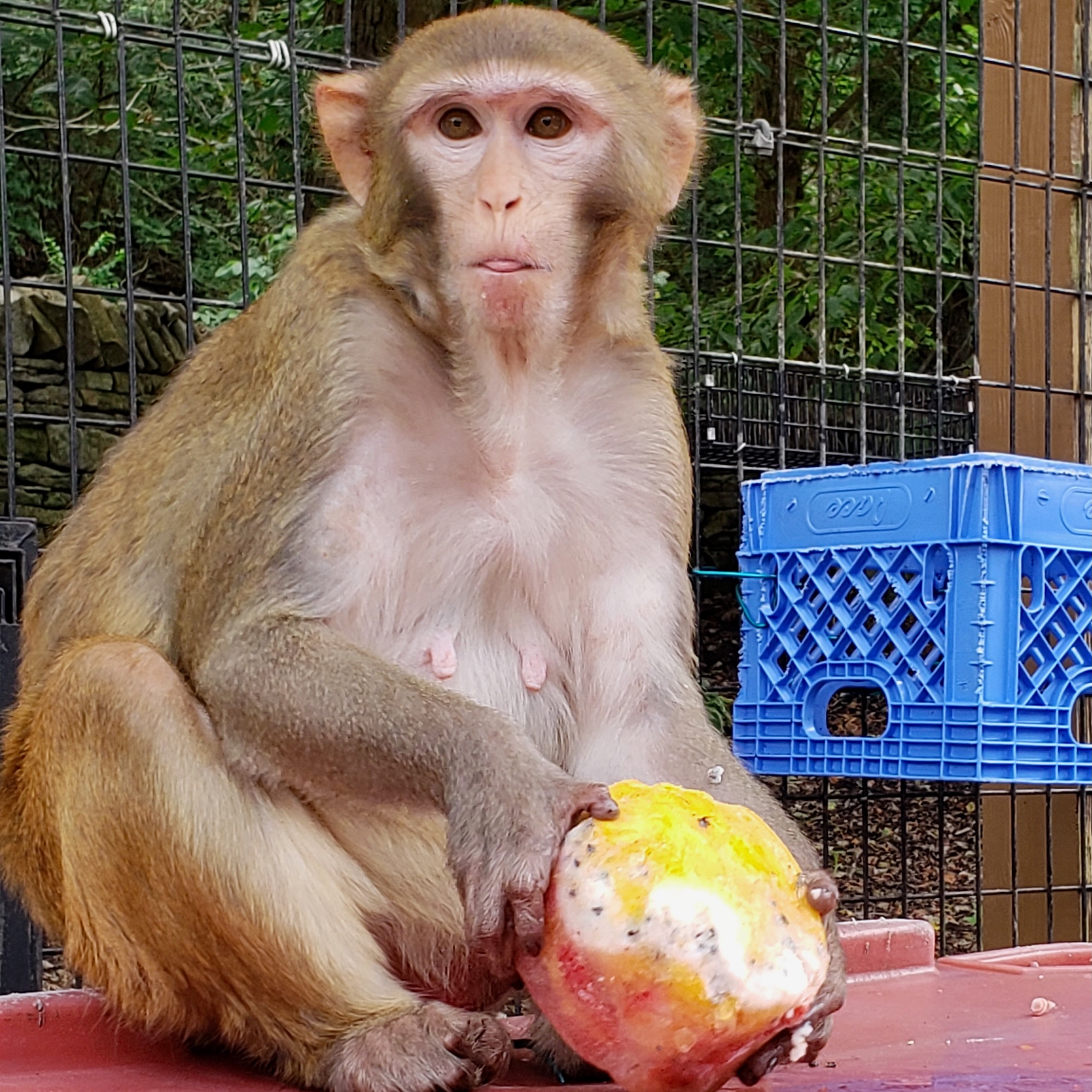 These days, Rainey is thriving with her new primate friends. She is quite the spunky girl and is full of energy! She loves to climb, swing, and bounce around her house all day. She is very sweet and strives to be the center of attention in her monkey group. Rainey also has a BIG appetite, and moves quickly from basket to basket to choose all her favorite fruits and vegetables. Grapes, avocados, peanuts, bananas, cherry tomatoes, and sweet potato are a few of her favorites.